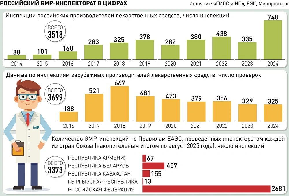 С 2016 года (в реализацию Федерального закона "Об обращении лекарственных средств" и в соответствии с постановлением правительства Российской Федерации от 03.12.2015 N 1314) стало возможным инспектирование иностранных производителей на соответствие Правилам GMP. Это обеспечило контроль за производством лекарственных средств, которые регистрируются и ввозятся на территорию нашей страны. На проведение таких инспекций (для целей выдачи Минпромторгом России заключений GMP) уполномочено Федеральное бюджетное учреждение "Государственный институт лекарственных средств и надлежащих практик" (ФБУ "ГИЛС и НП"). С 2014 года инспекторы "ГИЛС и НП" принимают участие в составе инспекционной группы Минпромторга России при лицензировании производства лекарственных средств на отечественных предприятиях.
